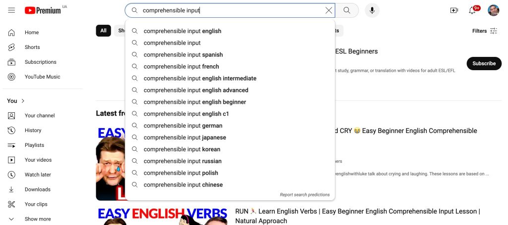 - Найти на YouTube контент Comprehensible Input (язык, например, английский).